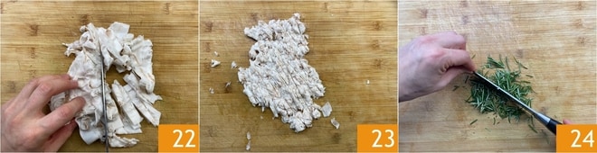 To prepare the cunza, cut the lard with a knife 22 trying to achieve a homogeneous consistency 23. Finely chop the rosemary needles as well 24