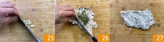 Finally, do the same with the garlic 25. Mix the ingredients 26 and continue chopping with the flat side of the knife without rushing, it will take about ten minutes to obtain a smooth and silky cunza 27.