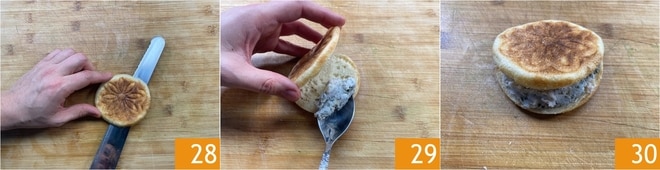 With a bread knife, cut a hot tigella in half 28, fill with cunza as desired 29, and serve while still hot. The tigelle are excellent on their own, but the crescentine with cunza will be a hit 30!