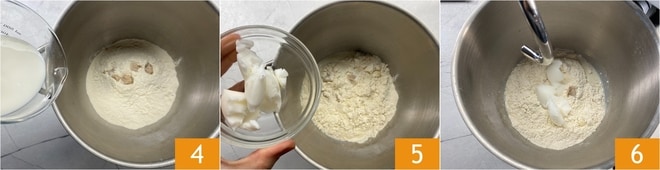 Add the milk 4 and the lard 5, then turn on the stand mixer equipped with a dough hook at low speed 6.