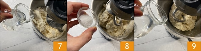 Once the first ingredients are incorporated, slightly increase the speed of the mixer and gradually add the water 7. At this point, also add the salt 8 and continue to pour in the water slowly 9, ensuring it is well incorporated into the dough.