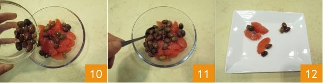 When you are finished, gather the segments in a bowl and add the black olives 10, then season with salt and pepper and mix everything 11. Finally, move on to the composition: on a serving plate, arrange some grapefruit and Taggiasca olive salad 12