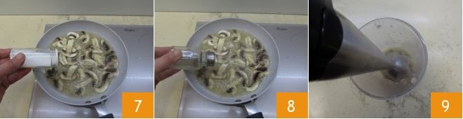 let it evaporate, then salt 7, pepper 8, and cook over low heat for 4-5 minutes. Once cooked, transfer 80 g of the mushrooms into a tall glass for an immersion blender, keep the other 200 g aside: they will be used to accompany the fillets. Blend the mushrooms with an immersion blender 9.