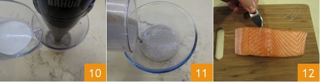 Add the milk to obtain a creamier mixture 10 and set it aside 11. Focus on the salmon: remove the bones with kitchen pliers 12 and the skin with a sharp knife if present.