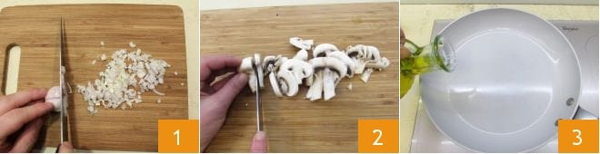 To prepare the crispy salmon fillet with Chardonnay sauce, first start preparing the accompanying sauce: chop the shallot 1, slice all 280 g of champignon mushrooms 2, then take a large pan, pour some oil 3