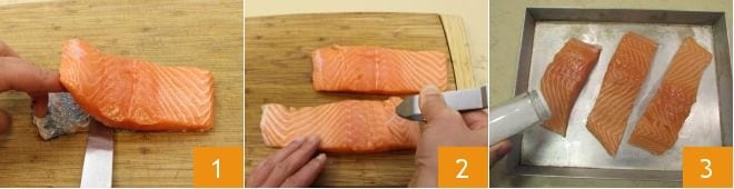 To prepare the herb-crusted salmon with noodles, first deal with the salmon: use a thin-bladed knife to remove the skin from the fillets 1 and the bones with the help of kitchen tweezers 2. Place the cleaned salmon fillets on a baking sheet and season with salt 3, pepper, thyme sprigs, and dill.