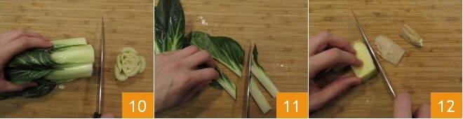 Meanwhile, clean the Swiss chard: cut away the stalk 10, wash the leaves, and chop them coarsely 11. Peel the ginger 12,