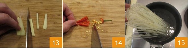 and cut it into thin strips 13. Now remove the chili pepper stalk, split it lengthwise, and remove the seeds 14. Cook the rice noodles in boiling salted water for about 6-7 minutes 15.