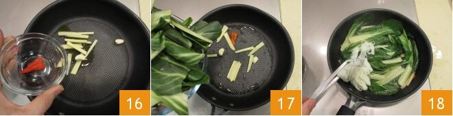 Meanwhile, heat the olive oil in a pan with peeled and whole garlic cloves, ginger, and chili pepper 16. Let them season for a couple of minutes, then add the Swiss chard 17 and cook everything for another 4 minutes. As soon as the noodles are cooked, drain them directly into the pan with the Swiss chard 18