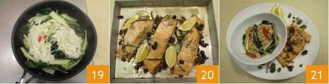 Mix to season 19 and when the salmon is also ready, remove it from the oven 20 and serve it together with the noodles 21.