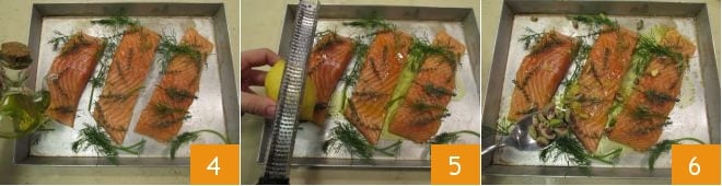 and the olives 7. Massage and mix the ingredients so they season evenly 8. Now add the lemon you grated, cut into wedges 9. Bake the salmon in a preheated static oven at 392°F for 20 minutes.