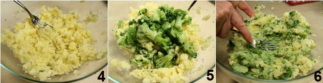 Then mash the potatoes with a fork. Add the well-dried broccoli to the bowl 5 and mash them as well 6.