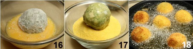 Prepare three small bowls with wheat flour, corn flour, and the two beaten eggs inside 14 and roll the prepared croquettes first in the wheat flour 15.
