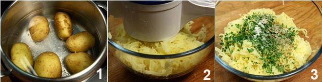 In a saucepan, bring salted water to a boil, then cook the potatoes with the skins on 1. Once cooked, peel them and mash them with a potato masher into a bowl 2. Then add the parsley, salt, and pepper to the mashed potatoes.