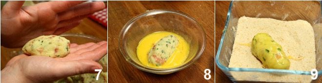 and take a portion of the mixture (about 1.8 oz) and shape it to form croquettes 7. Then dip the croquettes in beaten egg 8, and then in breadcrumbs 9.