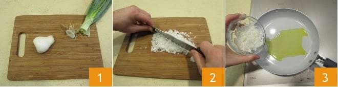 To prepare the pea and ricotta croquettes, start by cleaning the spring onion 1 and chopping it finely 2, then pour it into a pan with extra virgin olive oil and let it soften for five minutes over low heat 3.
