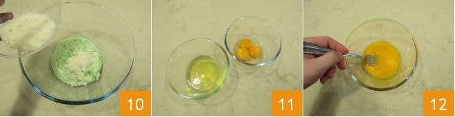 Transfer the cream into a bowl and add the grated Grana Padano DOP 10. Meanwhile, break the eggs and separate the yolks from the whites into two different bowls (the whites will be used for the breading) 11. Beat the yolks with a fork 12,
