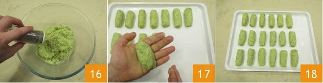 Finally, adjust with salt and pepper 16. Take 1.4 ounces of the mixture and shape it into croquettes, molding it 17 until you get cylinders, slightly rounded, 1.18 inches thick and 2.75 inches long: by doing so, you should get 18 pieces. Gradually place the croquettes on a tray where you have laid a sheet of parchment paper to prevent them from sticking to the bottom 18.
