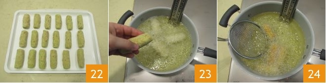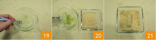 With a fork, quickly beat the egg whites for a few moments 19 and then dip each croquette one at a time 20, drain it well and then pass it in the breadcrumbs making sure the crumbs adhere to all sides 21