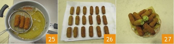 and repeat for all the other croquettes 22. Pour plenty of seed oil into a pan and let it heat up to 338°F (use a kitchen thermometer to measure the exact temperature), then pour in 4-5 croquettes at a time 23 in this way you will maintain a constant temperature and turn them occasionally to even out the cooking 24.