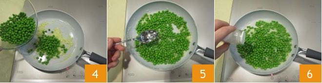 Then pour in the shelled peas 4, add some water 5 and a pinch of salt 6; let them cook for about ten more minutes, until the water has completely evaporated.
