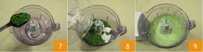 When cooked, let the peas cool slightly then pour them into a mixer 7, add the ricotta 8, and blend until you get a thick cream 9.