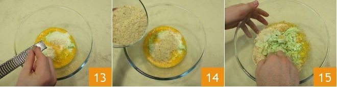 and pour them over the mixture. Grate the nutmeg 13, then add the breadcrumbs 14 and mix with your hands 15.