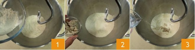 To prepare the croissants, start by placing all-purpose flour, Manitoba flour 1, crumbled fresh yeast 2, and water 3 into a stand mixer with a dough hook. Start the mixer at low speed and as soon as the ingredients are combined, increase to medium speed. At this stage, the dough should be elastic and soft: it will take about 5 minutes.