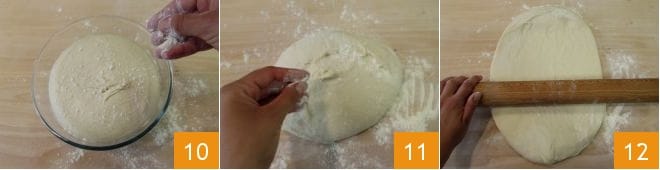 Once the indicated time has passed, take the dough, sprinkle a little flour on the surface 10, turn it out onto a lightly floured work surface, and dust the part that was in contact with the bottom of the bowl 11. Proceed by rolling out the dough with a rolling pin, gently without applying too much pressure 12
