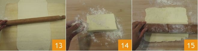 until you create a rectangle of 18x10 inches 13. Take the butter block, which should be pliable (you can take it out of the fridge about ten minutes before using it in the recipe). Lightly dust the work surface with flour, also sprinkle the butter lightly 14, and roll it out with the rolling pin, turning it occasionally, to give it a squared shape of 10x10 inches 15 with a thickness of about 1/5 inch.