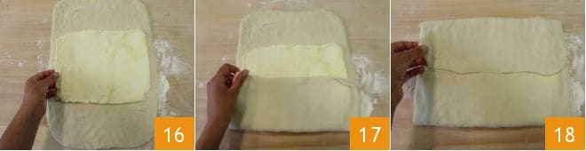 Remove the excess flour and place the square of butter in the center of the rolled-out dough 16. Fold one of the two edges of the dough towards the center 17, then do the same for the other edge without overlapping too much 18.