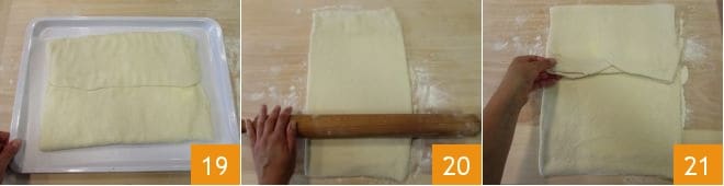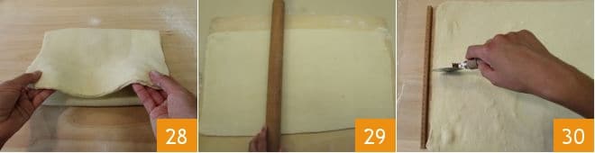 and folding the dough 28. This time, however, you should leave the dough in the refrigerator covered with plastic wrap for at least 2 hours. After this time, take the dough: lightly flour the work surface, lightly flour the dough, and proceed to roll it out always in the direction of the openings to a thickness of about 1/8 inch. You should obtain a rectangle of 16x24 inches 29; while working to roll it out, lightly flour and flip it occasionally. Take a ruler, divide the rectangle in half 30, widthwise,