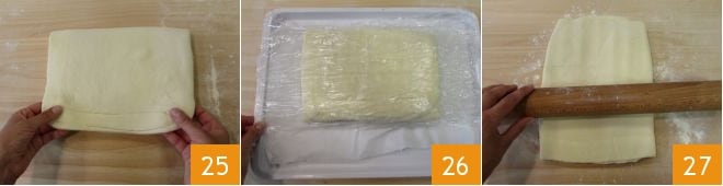 and folding the edges as previously indicated 25; once you've completed the second 3-fold, you can place the dough back in the fridge wrapped in plastic wrap for 30 minutes 26. After this time, you can proceed with the third and final fold with the same previous steps of rolling out 27
