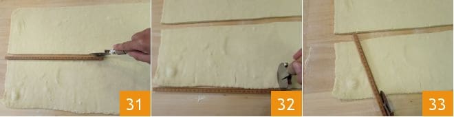 to obtain two rectangles of 8x24 inches 31. At this point, using a pastry cutting wheel, make incisions every 4 inches on one side of each rectangle 32. Then on the other side of the rectangle, mark a point every 2 inches 33, without cutting; this will be the tip of your croissants.