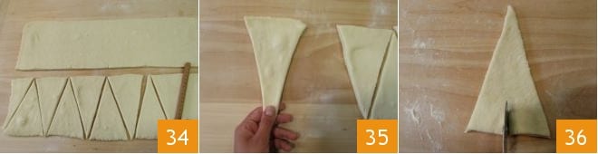At this point, cut the dough to form your triangles 34. With these amounts, you'll obtain about 22-24 triangles. Start forming your croissants: take a triangle of dough, holding the base with one hand, stretch it slightly by pulling the tip gently 35 and make a cut in the center of the base about 1 inch long 36.