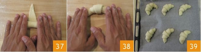 Then roll the croissant onto itself, gently stretching towards the tip 37 and then closing it into a crescent shape 38. You should achieve 3 complete turns, or 4 spirals. Gradually place the croissants on a baking sheet lined with parchment paper, spacing them out 39. Let the croissants rise in an off oven with the light on or in a draft-free room for an hour and a half.