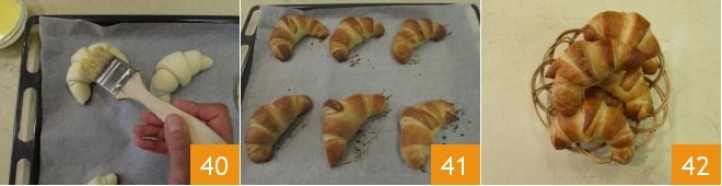 After this time, in a small bowl beat the egg yolks with the milk: brush your croissants with a very soft brush 40, this way after baking they will be golden and shiny. Bake in a preheated, convection oven at 392°F for about 25 minutes. Check them frequently during baking, without ever opening the oven door. Once baked 41, remove your croissants from the oven and enjoy them hot 42!