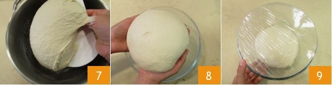 Remove it with a dough scraper 7, shape it into a ball, then transfer it to a large bowl 8 and cover with plastic wrap 9. You should let it rise in a draft-free room (or in a switched-off oven with the light on) for about 2 hours. Alternatively, you can put it in the fridge overnight: this will make the dough even more workable. Before placing it in the fridge, leave it covered at room temperature for about an hour.
