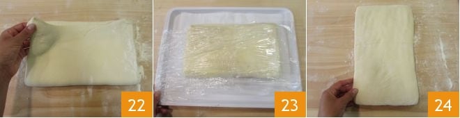 and then cover with the other edge 22. The first fold is done: you can wrap your dough again in plastic wrap 23 and place it back in the fridge for 30 minutes. Then proceed in the same way by rolling out the dough always in the direction of the openings 24