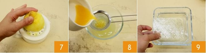 Squeeze all the citrus fruits 7 and at this point, strain the juice mix with a sieve 8. Set it aside and proceed with cooking the curd. Place the gelatin in a little cold water to soften it 9.