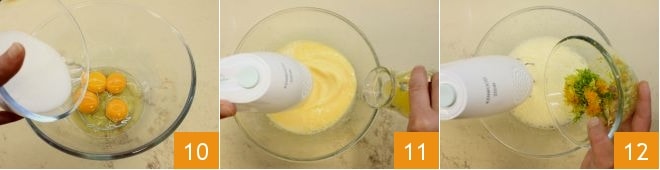 In a large bowl, put the egg yolks, whole eggs, and sugar 10 and using electric beaters, whip until you get a light and frothy mixture. At this point, slowly add the citrus juices 11 and their grated peels 12, continuing to whip to mix the ingredients well.