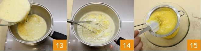 Now transfer everything to a saucepan to cook the curd in a double boiler 13: if you don't have the appropriate utensil, place a bowl with the mixture in a pot filled with a few fingers of water, ensuring the bottom does not touch the water. Cook on low heat for 2-3 minutes, stirring with a whisk, then add the butter cut into pieces 14 and cook for another 10 minutes until you obtain a thick cream that you should strain with a sieve, using a spatula 15.