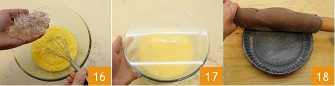 Drain the gelatin and squeeze it well, then add it to the cream and dissolve it by stirring carefully and for a long time 16. If necessary, strain it again. Cover the cream with plastic wrap 17 and let it cool in the refrigerator for at least 1 hour. Meanwhile, bake the tart base: place the shortcrust dough on a lightly floured work surface and roll it out with a rolling pin to a very thin thickness, about 1/5 inch, then wrap it around the floured rolling pin and lay it on a previously buttered and floured 9 1/2-inch tart pan 18.