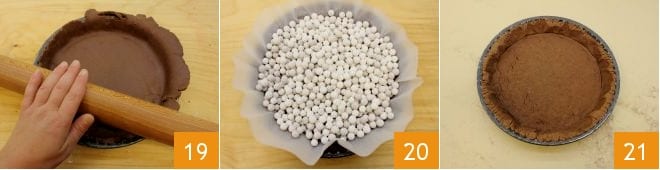 With the help of the rolling pin, trim the excess dough from the edges 19, then line the base with parchment paper and place baking weights on top (if you don't have them, you can use dried beans) 20. Bake in a preheated static oven at 340°F for 40 minutes (if using a fan oven, 300°F for 20 minutes), and once cooked, let the tart cool in the pan 21.