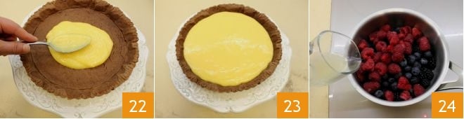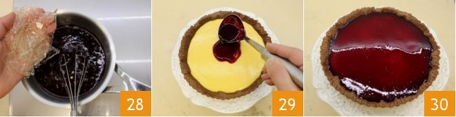 Transfer the sauce to a saucepan and add the gelatin removed from the water and well-squeezed, then dissolve it over low heat, stirring the mixture for 5 minutes 28. Turn off the heat and take the filled tart out of the refrigerator. Pour the hot coulis over the surface, using a ladle 29 and dosing it so that it does not overflow from the tart 30. Place the dessert back in the refrigerator for at least another 2 hours.
