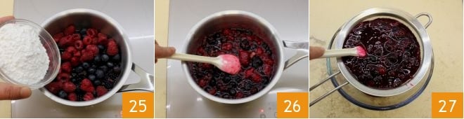Add the powdered sugar 25, stir until everything is well combined, then let it cook for another minute on low heat 26. Strain the obtained mixture with a sieve to remove any seeds: press the fruits with the back of a spoon and collect the sauce in a small bowl 27.