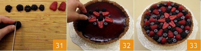 Once the necessary time has passed, you can finish with the decoration: cut the berries 31 and arrange them as you like on the tart 32.
