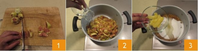 To prepare the hazelnut tart with Fig Jam, start by making the jam. After peeling all the figs, cut them into 4 parts 1, place them in a pot with water 2 and bring to a boil. Shortly after, add the sugar, lemon juice and zest 3