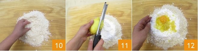 Pour the sandy mixture onto a work surface and form a well 10, in the center add the powdered sugar, the grated lemon zest 11, and the egg 12.