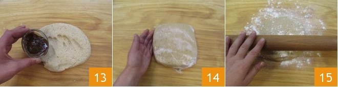 Quickly knead by hand, to avoid warming the dough too much, and also add the hazelnut paste 13; when the paste is completely absorbed, wrap the dough in plastic wrap and let it rest in the refrigerator for about 30-40 minutes 14. After this time, take the dough and roll it out on a lightly floured surface, using a rolling pin, roll it out to a thickness of about 0.2 inches 15. Save the leftover dough for the decoration strips.
